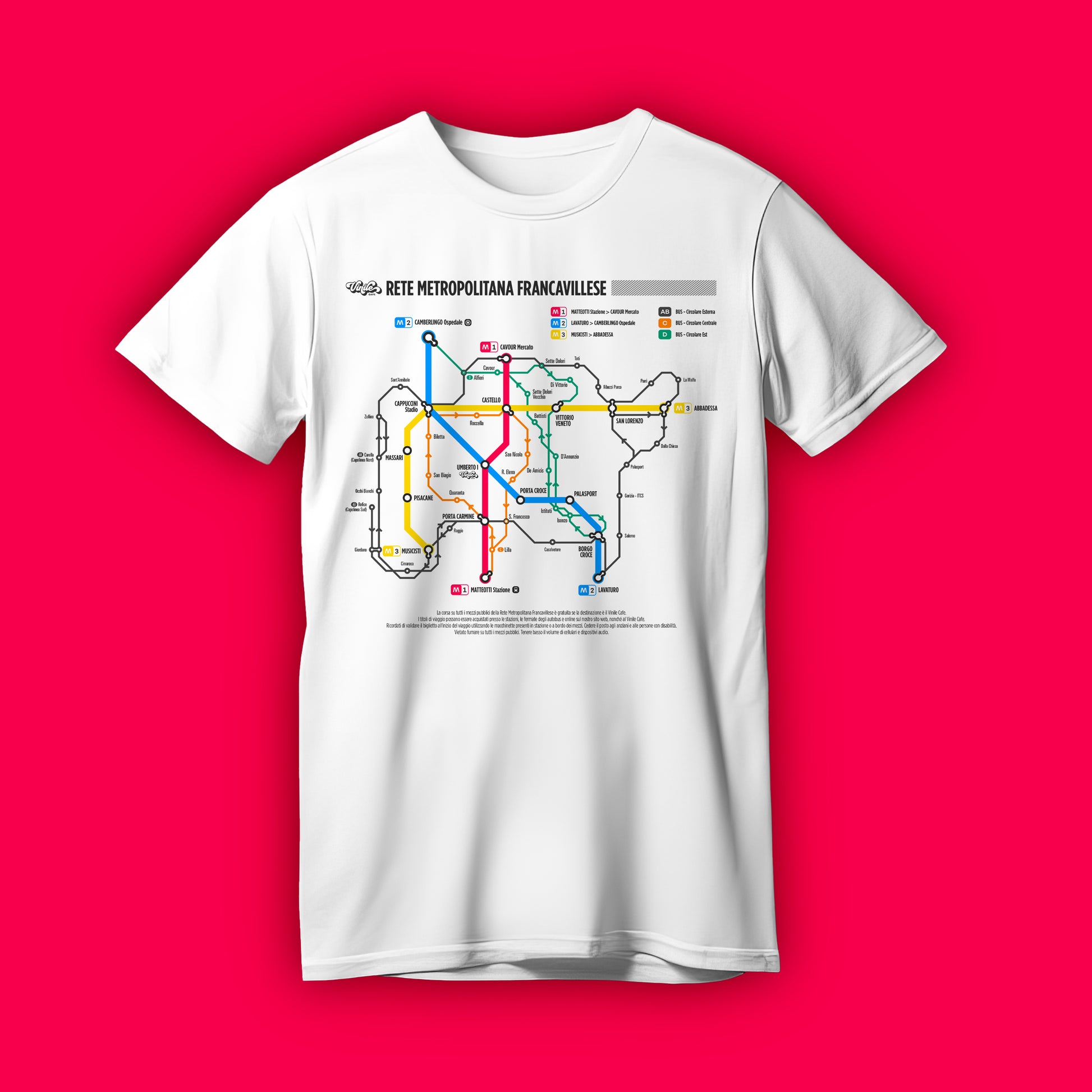 Un omaggio ironico e creativo alla città. Questa t-shirt trasforma Francavilla in una vera rete metropolitana, con linee, fermate e collegamenti che raccontano luoghi, quartieri e punti di ritrovo iconici legati all’universo Vinile.